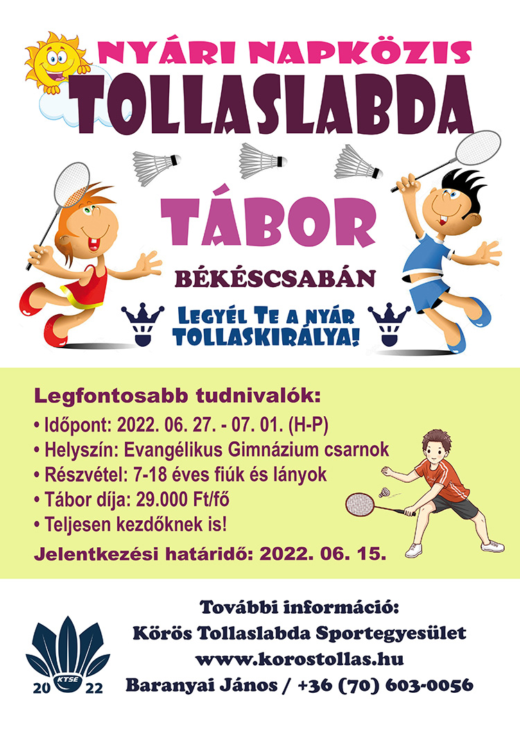 Szeretnél egy igazán jót tollasozni? Várunk a KÖRÖS TOLLASLABDA SPORTEGYESÜLET nyári tollaslabda táborába, ahol megismerheted a tollaslabda sportot, a világ egyik leggyorsabb, legélvezetesebb labdajátékát! (Ütőt, labdát, hálót, termet biztosítunk.) Szabályismeret, ütésfajták, pályamozgás, meccsek, rengeteg játék és mozgás, egész nap közösségi élmények!
